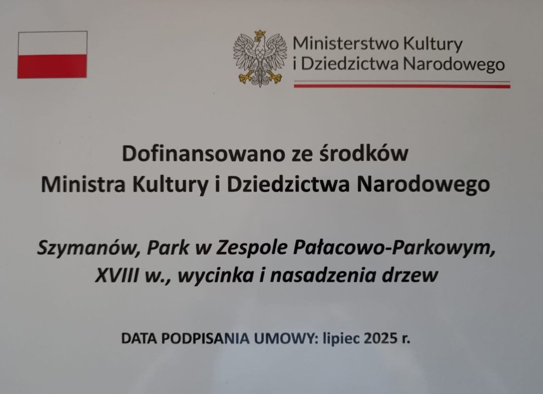 Ministerstwo Kultury i Dziedzictwa Narodowego, poprzez umowę zawartą w dn. 14 lipca 2025 roku, przyznało Zgromadzeniu Sióstr Niepokalanego Poczęcia NMP, Dom Zakonny w Szymanowie, dotację z budżetu państwa na realizację zadania pn. "Szymanów, Park w Zespole Pałacowo-Parkowym, XVIII w., wycinka i nasadzenia drzew."